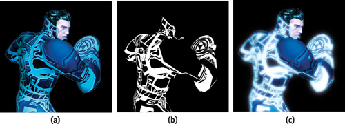 Dabei wird ein reguläres Rendering einer Szene (a) mit einem Rendering der emmissiven Teile der Szene (b) kombiniert ©, wobei letztere vorher tiefpass-gefiltert wird (Blur).