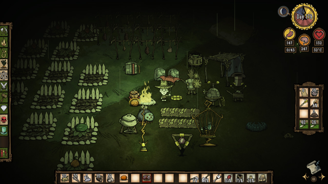 Aber eines sollte man bei jedem noch so gut ausgebauten Lager nicht vergessen: In der Don’t Starve-Welt ist man nie wirklich sicher (spätestens seit der Einführung der Giganten mit dem DLC „Reign of Giants“) und der Tod gehört einfach zu Don’t Starve dazu. Er ist ein gewolltes Element, mit dem die Entwickler dem Spieler vor dem Bildschirm immer wieder tatsächlich das Gefühl geben in einer Welt gelandet zu sein, über die sie nie wirklich Kontrolle erlangen werden. Und doch gibt es bei jedem Tod doch noch eine kleine Belohnung: Man bekommt Erfahrungspunkte, mit denen man die restlichen Charaktere der Don’t Starve-Welt nach und nach freischalten kann.