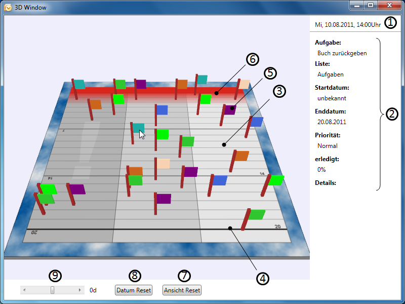 Die Abbildung zeigt das fertiggestellte Outlook-Addin. In der Mitte des Fensters ist das 3D-Fenster dargestellt. Im unteren Teil des Fensters befinden sich mehrere Schaltflächen zur Steuerung des 3D-Fensters. Auf der rechten Seite befindet sich ein Frame mit Informationen zu einem Task. Es folgt eine Beschreibung der nummerierten Komponenten: