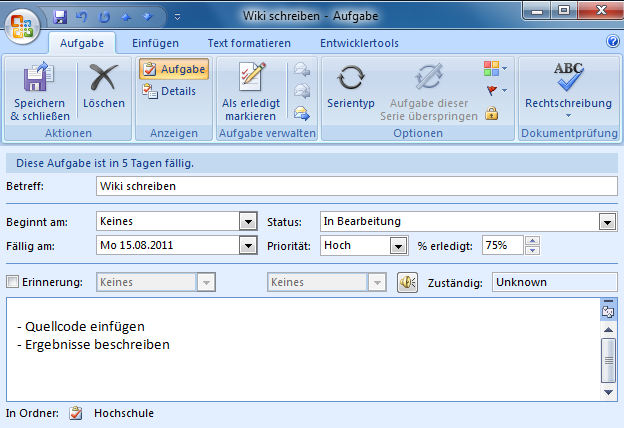 Bild: Erstellen einer Aufgabe in Outlook 2007